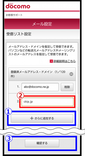 「さらに追加する」を押し、文字の入力欄に「ckip.jp」を入力、画面の一番下にある「確認する」を押す。