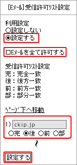 利用設定で「設定する」に●を付け、□Eメールを全て許可する のチェックは外す。