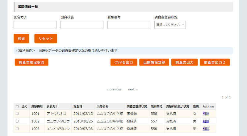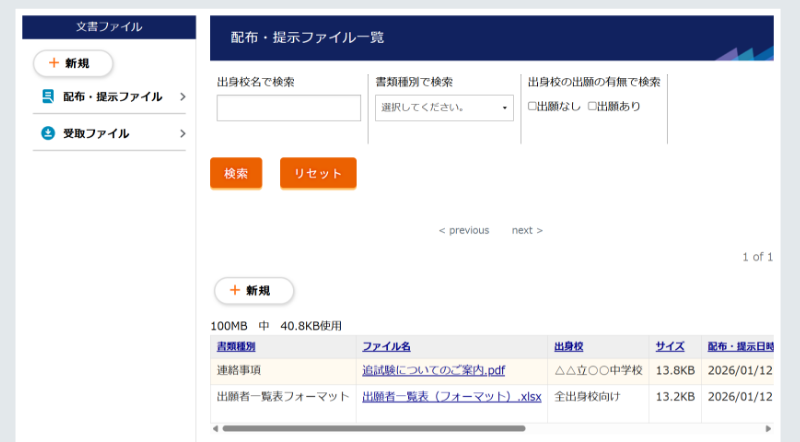 中学校から提出される推薦書、出願者一覧や評定分布表等を、高校が指定した形式で集約し、受領状況や内容確認を一元管理することができます。